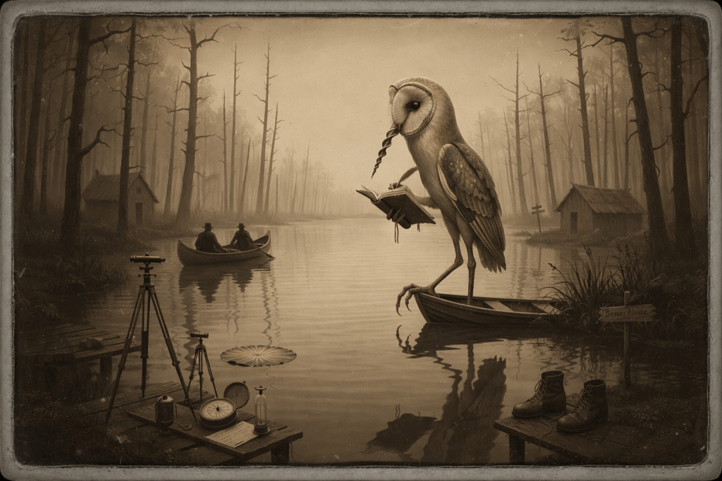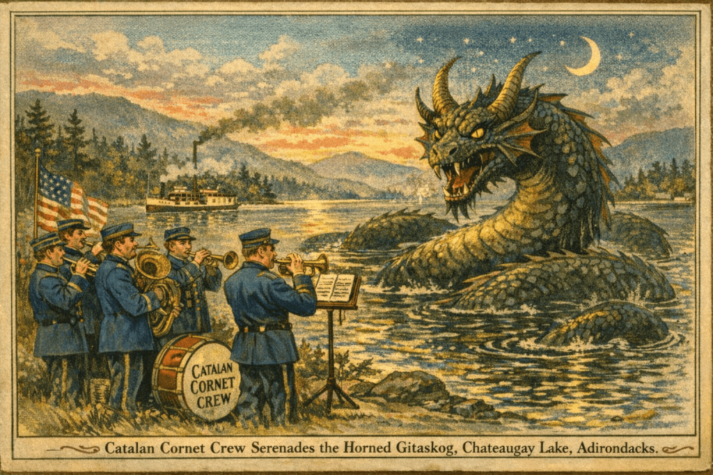 Born on the docks in the 1870s, the Steamboat Pirate Improv Players been raisin’ racket ever since—sawblade fiddles, drone- hum, trapline stomp, and harmonies that won’t sit still. They learned from passin’ composers, prophets, and lake-things—the Sea Serpent, Little Nippers, Wendigo hummin’ low. Tools is digital now, but the rule’s the same: listen hard, play true, let the woods finish it.