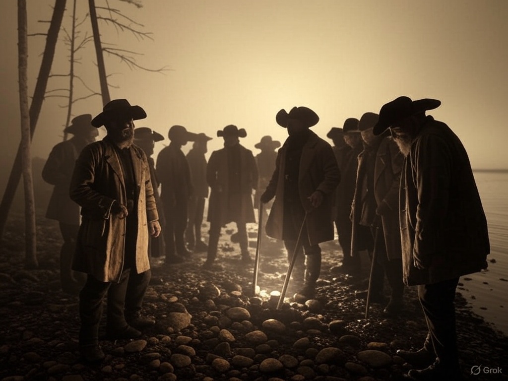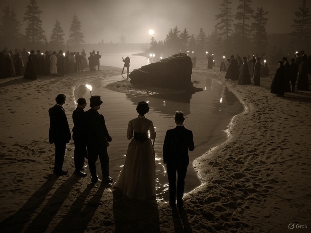 The scene, my friends, was now firmly set for the most delicious brand of gossip and eager speculation. The whispering grew loud, and what had begun as a local curiosity soon transformed into the talk of the entire Adirondack region. Guides and hunters arrived, peering across the water, searching for any sign of truth in Miller’s outlandish claim. Could it be that Chateaugay Lake was the epicenter of cosmic significance? Perhaps the very stones themselves held keys to unlocking the secrets of the universe!