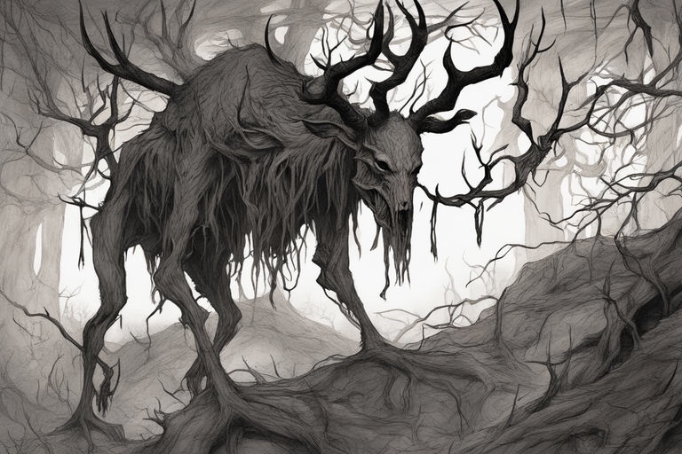 I licked my dry lips and took a step closer. My lantern illuminated the thing in the shadows. Not just one creature, but several…arrayed in a grisly mound of tangled limbs and vacant eyes. Their features were eerily human-like, though with elongate limbs, massive claws, antlers, and stag-like muzzles.
