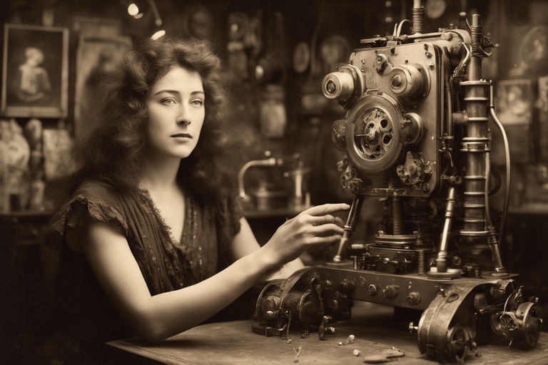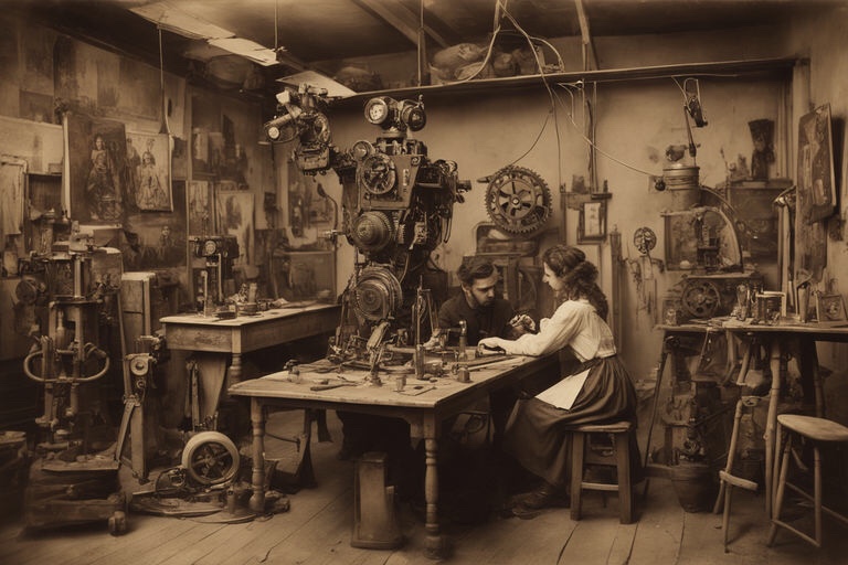 Evelyn, a young woman in a stained smock, tinkers with a device while her partner Jack sketches designs at a workbench.