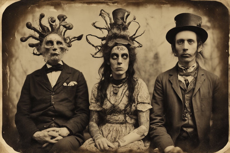 From the flashing maelstrom, three bizarre figures materialize in the yard -Haircus, Dalimira, and Exorxon. They are cosmic punkish Art-freaks, adorned in outlandish attire and bizarre tattoos.