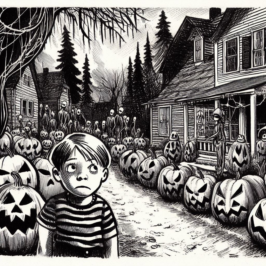 Finally Eddie reached the peeling white gate in front of his house. As he slipped through, a floorboard creaked on the porch. Eddie’s head snapped up. The jack-o-lanterns leered back at him, their flickering light playing tricks on his eyes. Heart pounding, he bolted for the front door.