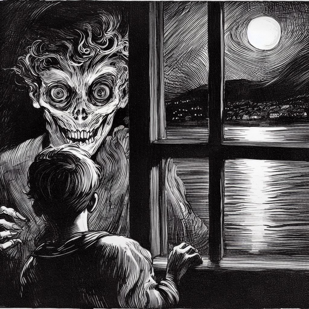 Eddie forced his eyes open. The creature loomed over the bed, exuding the stench of decay. It stretched its withered lips back from crooked brown teeth in a gruesome mockery of his ma’s gentle smile.