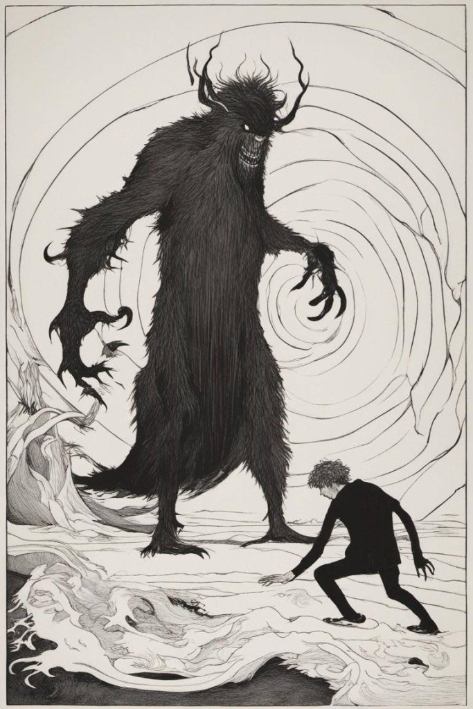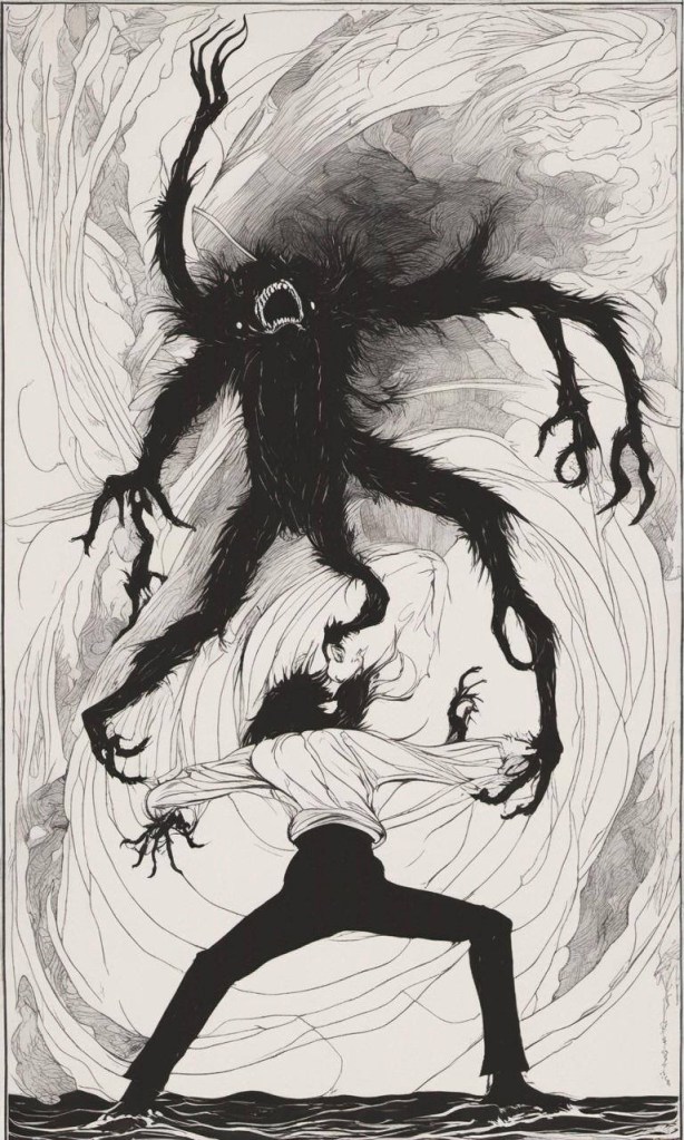 “She’s mine now!” The ma-thing grasped Eddie’s wrist in its icy vice-like grip. He screamed as its claw-like nails sank into his flesh. He thrashed and fought, but its preternatural strength held him fast.