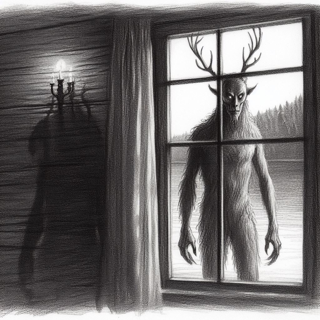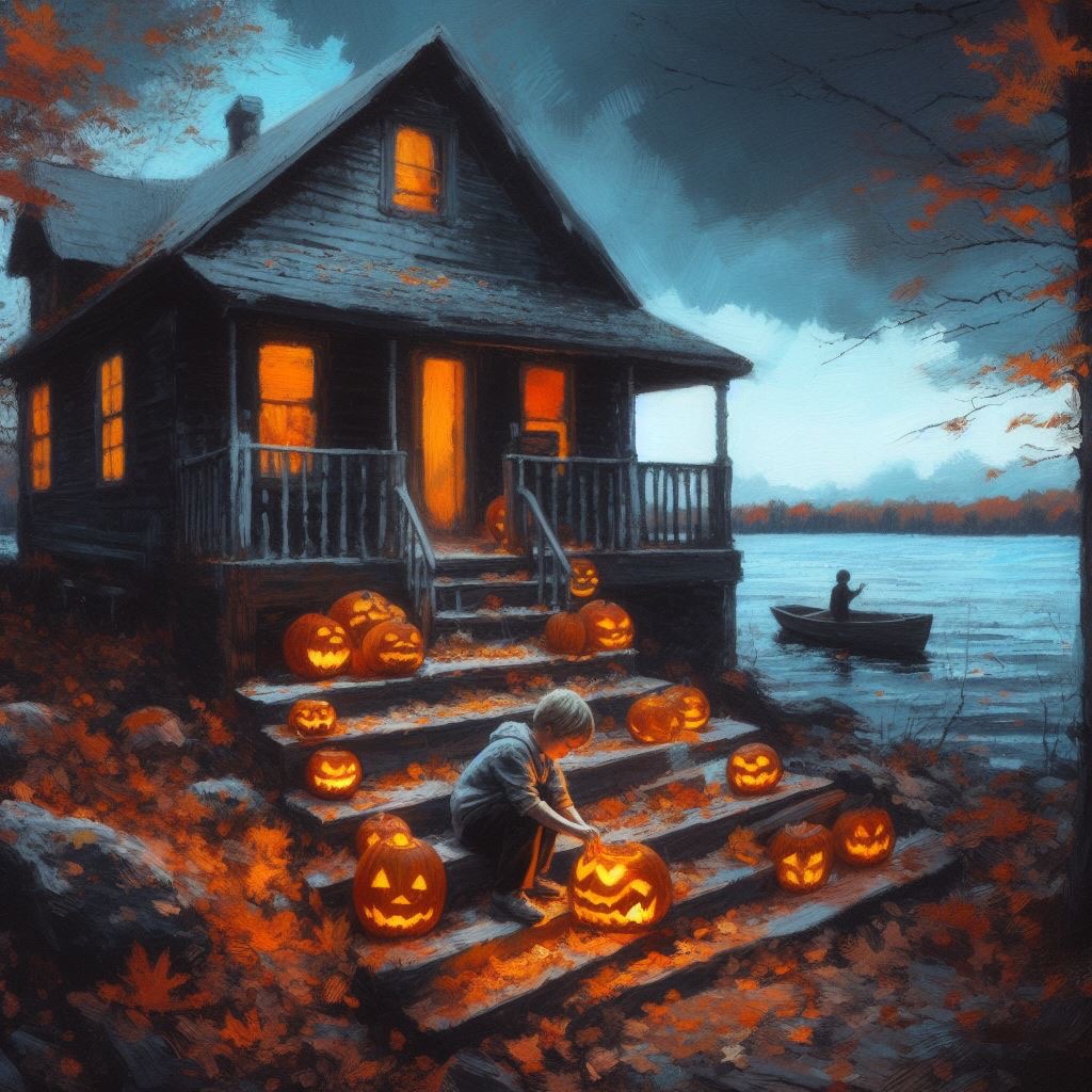 Up ahead, he could see the lantern-lit porches of the village houses, already decorated for Halloween. Jack-o-lanterns bearing twisted grimaces lined the steps, their flickering candles sending spidery shadows dancing across the weathered clapboard walls. From across the lake came the distant sounds of raucous laughter and jaunty fiddle music – the village Halloween party well underway.