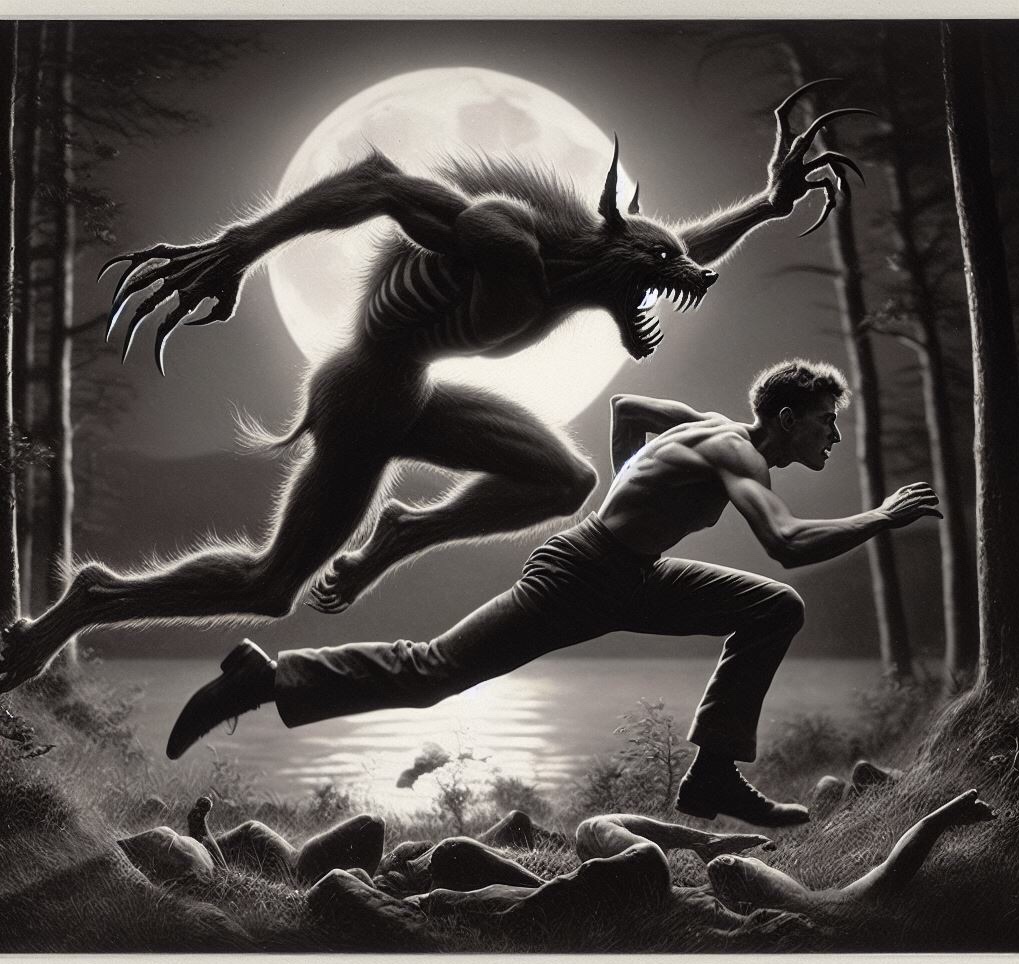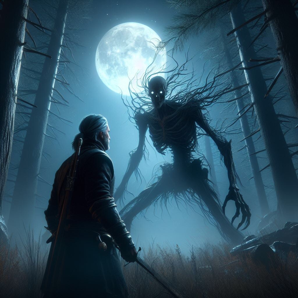 Panic constricted his throat, but curiosity burned brighter. He followed the sound, his heart hammering against his ribs, until he stumbled into a clearing. There, bathed in the moonlight, stood a figure impossibly tall, skeletal, its eyes burning with an unholy hunger.