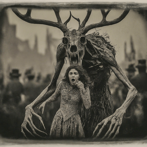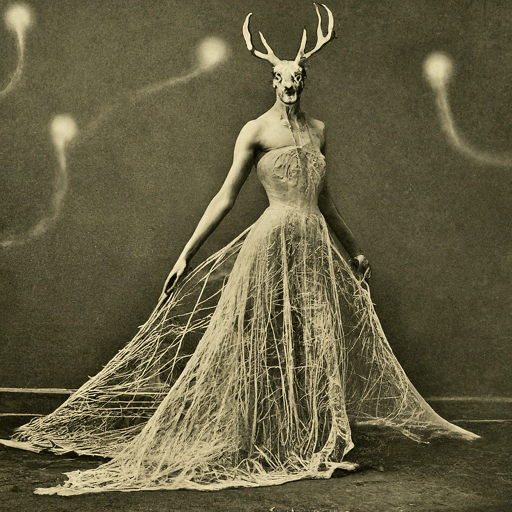 And from the vortex, the Wendigo itself materialized. A skeletal figure, its ribs like gnarled branches, its eyes burning embers. It reached a bony claw towards the model, who stood frozen, the spiderweb dress shimmering in the spectral glow.