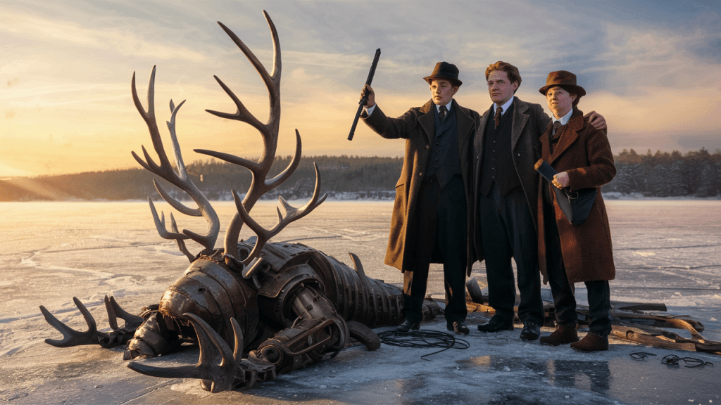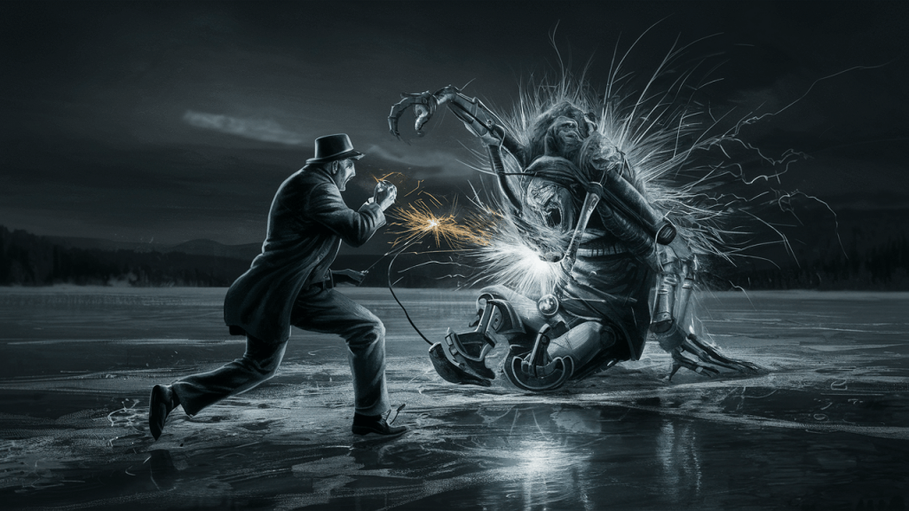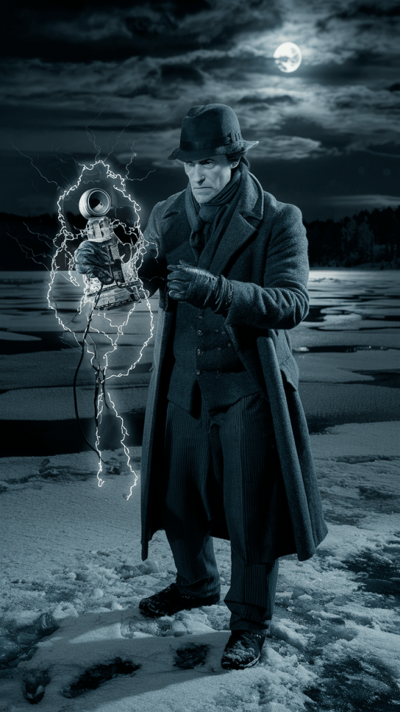 Holmes (Examining the handprint, eyes narrowed) The automaton is not alone. There’s a spectral presence clinging to it. It seems the 1902 fire that destroyed Miss Aubay’s lab-boathouse, only freed the machine, not the vengeful spirit within. Keep your sidearms at the ready, gentlemen!