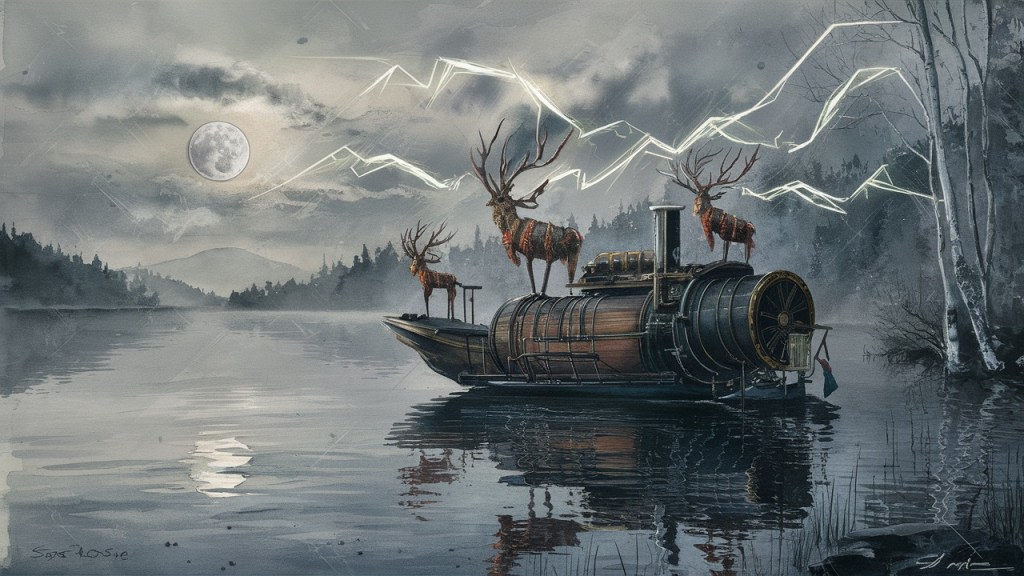 Nestled atop the misshapen metallic forms were three of the Electric Wendigos, their bulbous red eyes glowing malevolently in the moonlight. Evelyn, perched precariously at the stern, wrestled with a malfunctioning outboard motor that sputtered and coughed like a consumptive jazz trumpet clogged with spittle. It was simply just all part of the glorious, chaotic mess she’d come to expect when dealing with her magnificent creations.