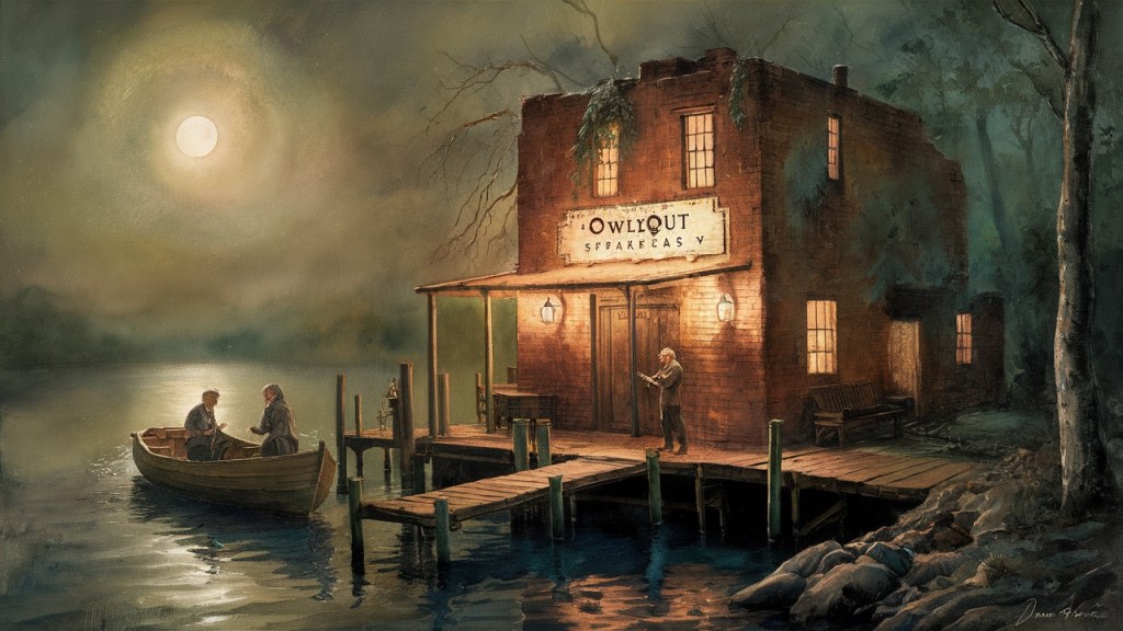 The Owlyout Speakeasy, a ramshackle building reeking of spilled liquor and good times, pulsed with anticipation. Just as Evelyn’s boat lurched to a halt in front of the rickety dock of the Owlyout, Mel drew his bow across the strings of his violin. The first notes, resonating with surprising power, carried across the lake, a hauntingly beautiful melody that seemed to weave its way through the very fabric of the night. It was a melody born of the wind whistling through pines, of the lapping water against the shore, of the stories whispered by the ancient mountains – the very essence of Chateaugay Lake.