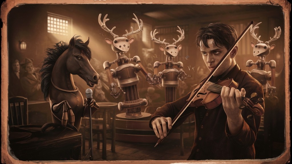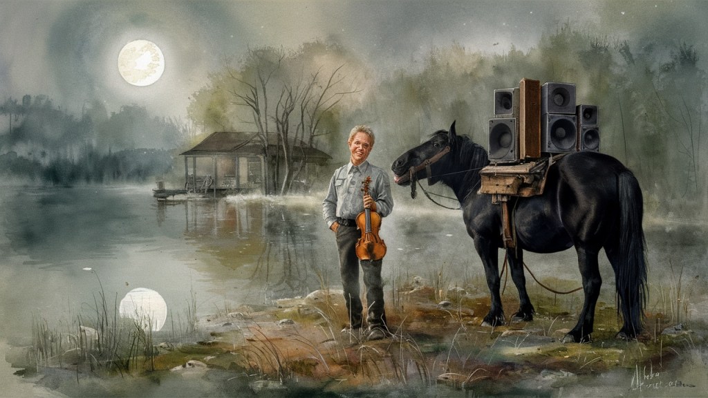 His faithful companion, Old Jack, a retired Black Horse Troop B steed, snorted impatiently, pawing at the ground. Unlike the groaning launch, slowly but loudly lurching its way across the lake, Jack’s presence was silent, a dark silhouette against the moonlit landscape. Unbeknownst to the crowd, Old Jack served a far more crucial purpose this night. Strapped to his back was a contraption of Mel’s own design – an array of salvaged loudspeakers, wirelessly connected and powered by Mel’s ingenuity. He’d spent days tinkering, using his knowledge of capacitors and transduction to amplify his fiddle’s sound to a level that rivaled a brass band. After all, a good ol’ fiddle, played with Mel’s unmatched mastery could surely counter the cacophony of Evelyn’s electric nightmares.