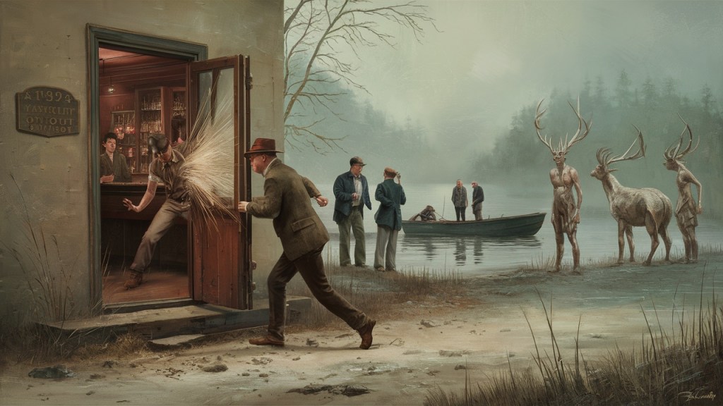 “Citizens of this clandestine hootenanny!” Old Jack boomed— “In the heart of Chateaugay Lake, where the whispers of the wind and water converge, we find ourselves at the crossroads of creation and chaos. Hear the fiddle’s call, a symphony of serenity, a melody that speaks of home and harmony. Yet, behold the Electric Wendigos, harbingers of havoc, their dissonance a dirge of discord!”