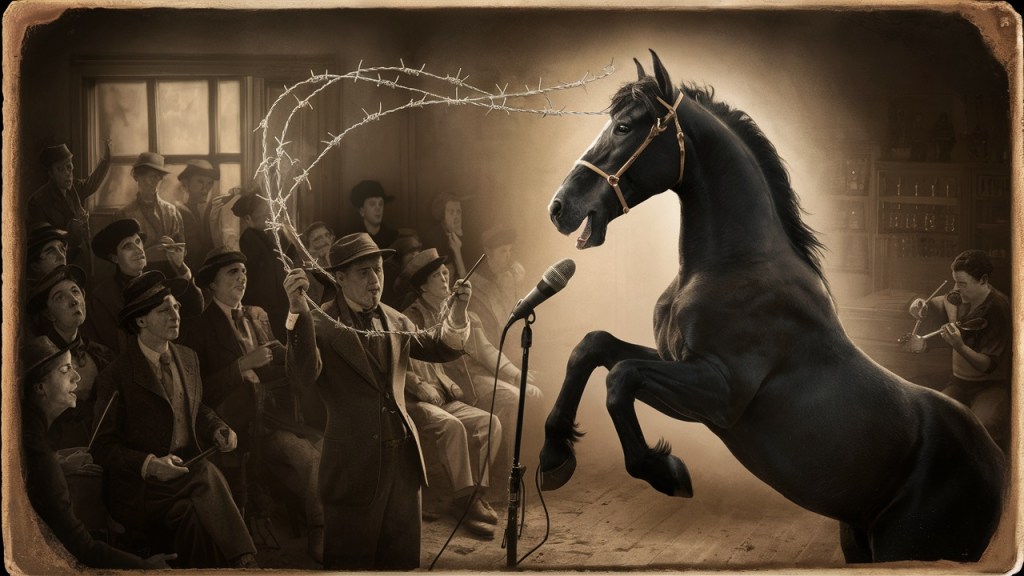 As the air shimmered around Old Jack he continued, adopting a rhythmic cadence that matched the beat of Mel’s music. With a theatrical flourish, a microphone materialized in mid-air, held aloft by a spectral bridle fashioned from barbed wire. The horse, assuming a dramatic stance with his forelegs planted firmly on the dusty floor and his voice amplified by the microphone, addressed the bewildered crowd.