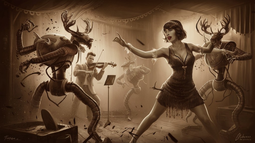 Jack, now fully in his element, shifted into a Dadaistic stream-of-consciousness monologue, his words flowing like jazz scat. “In the prohibition nights, where shadows dance and secrets prance, we decode the rhythm of rebellion. Flapper flaps and fiddler flings, an esoteric jam, an iambic slam. The north country sings, in symbols and strings, a tale spun in the moon’s silver gleam.”