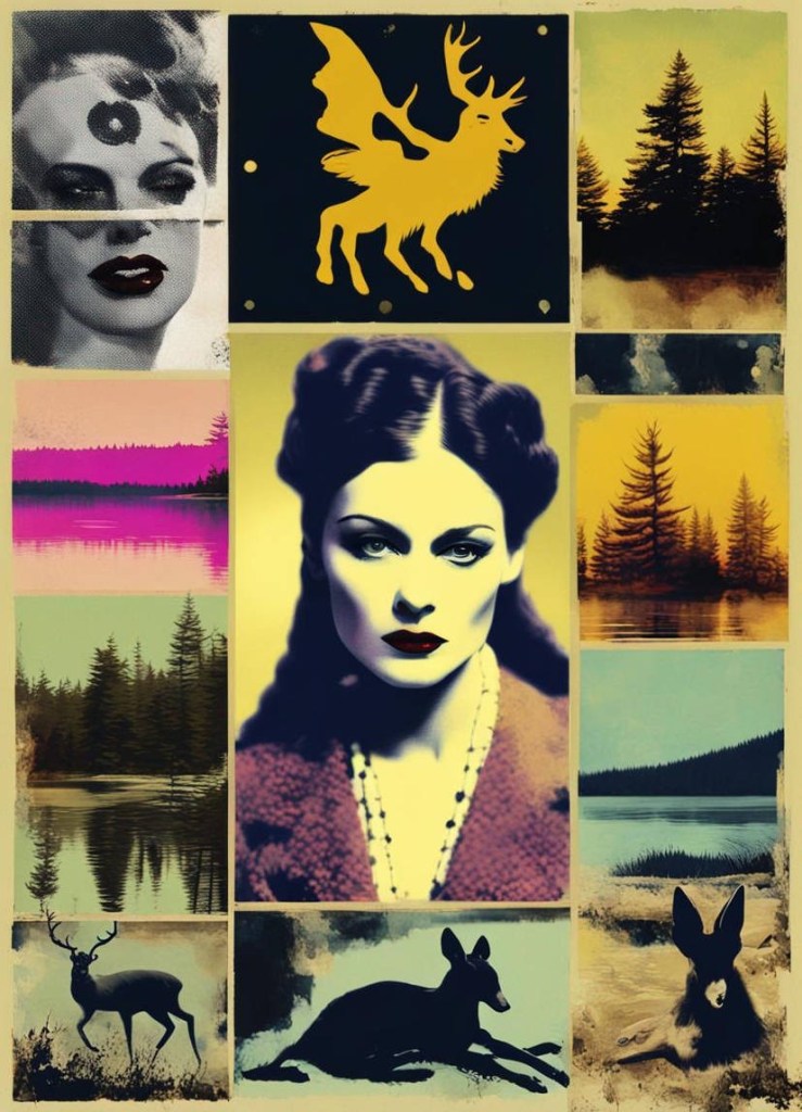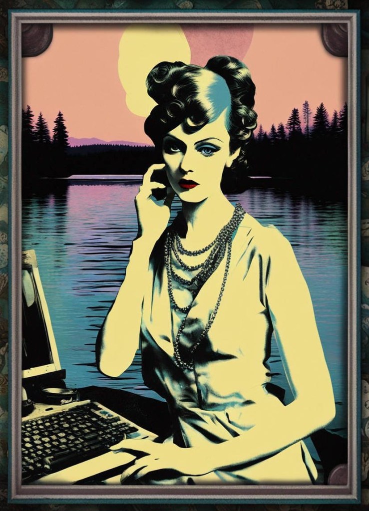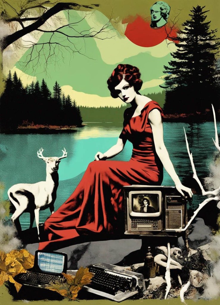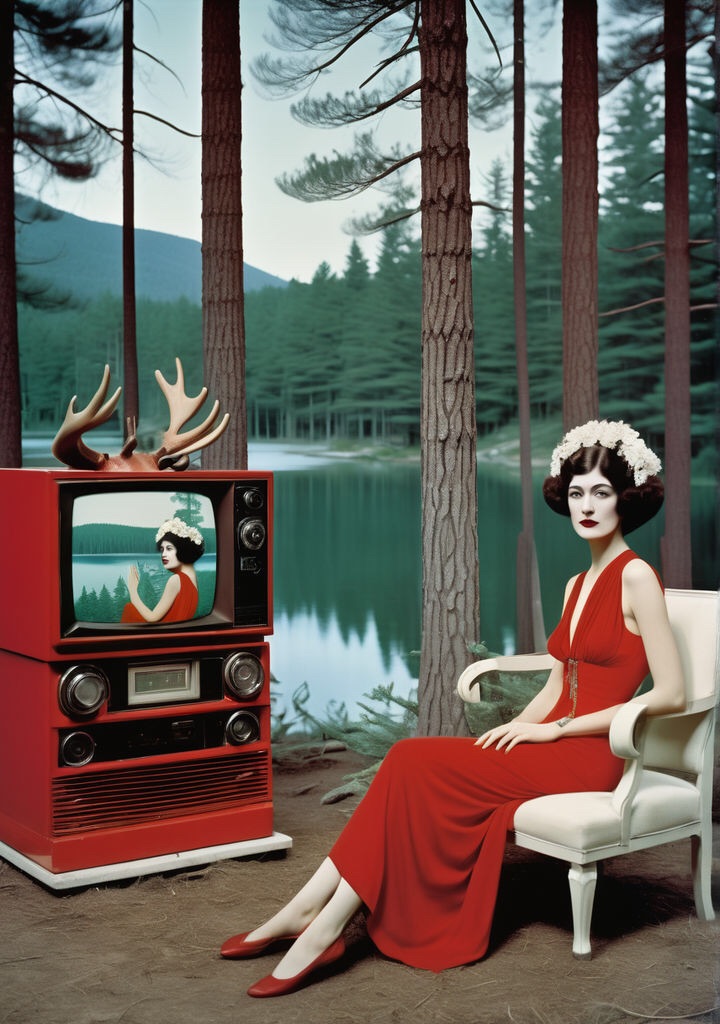 Evelyn, with her enigmatic beauty captured for novelty sepia-toned souvenir photographs, often reflected on the words of Ralph Waldo Emerson: “Adopt the pace of nature: her secret is patience.” She sat by the lake, her red dress a stark contrast against the emerald backdrop, her thoughts as deep as the waters before her. The flickering screen of an old television set beside her displayed a monochrome image of her own face, an echo of her past, a reminder of the time when she was the muse of artists and the fascination of the masses.
