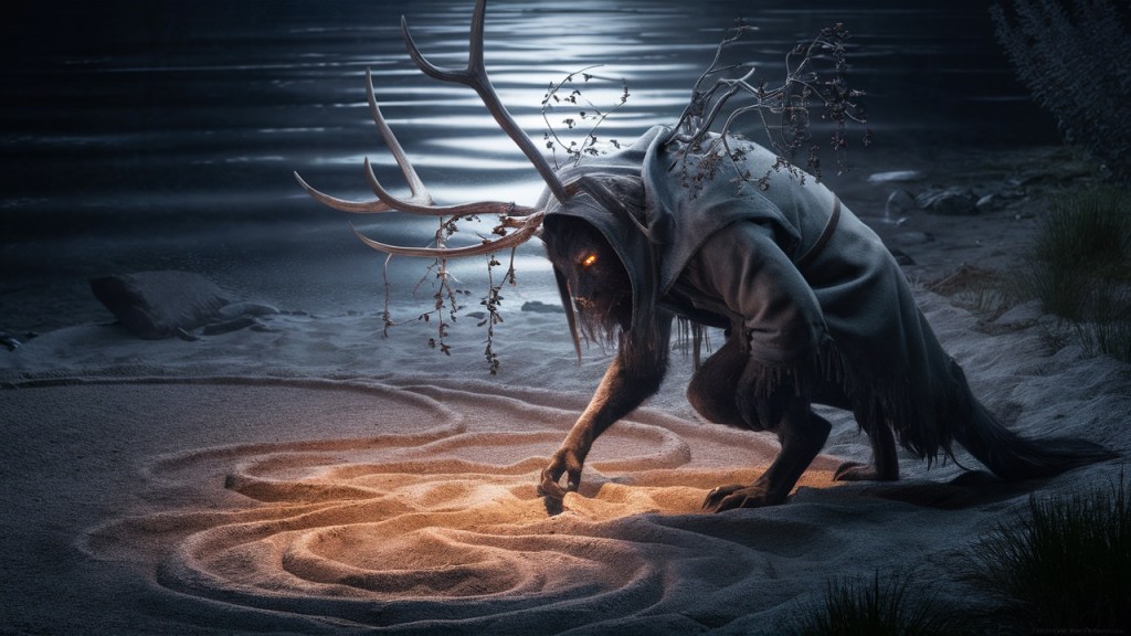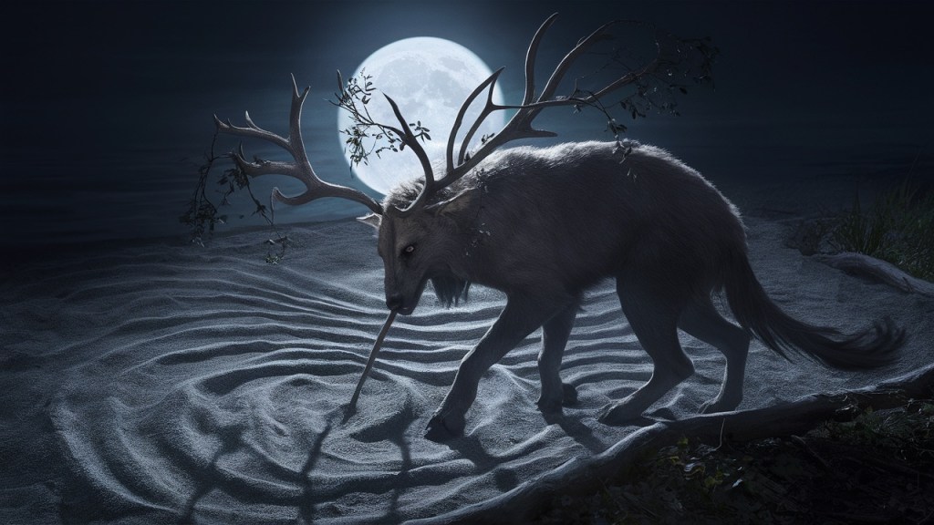 “In the silver light of the full moon, the boundary between our world and the spirit realm grows thin. It is then that the Wendigo comes to dance upon the sands, its antlers painting dreams in the stillness of night.” – Elder Thomas Skye, Local Algonquin Storyteller