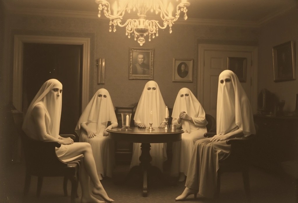 Several attendees claim to have seen a misty, humanoid shape materialize above the séance table, though it dissipated before it could be clearly photographed. The above image, taken by local photographer Abigail Flashbulb, shows what some are calling evidence of an ectoplasmic manifestation.