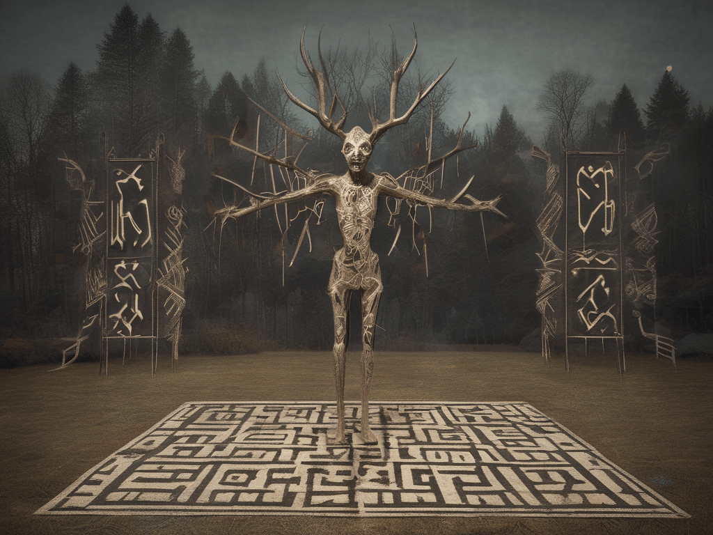 - A central Wendigo-inspired symbol, serving as a focal point for the piece’s thematic content.