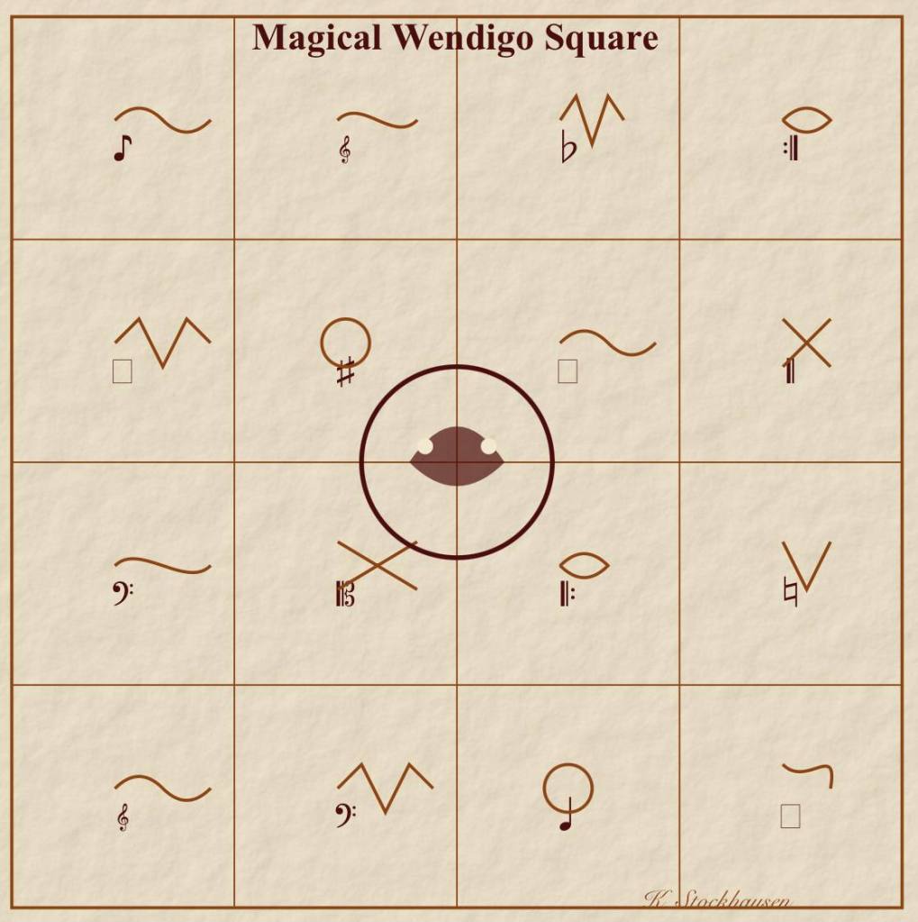 The “Magical Wendigo Square” is a tool for both composition and performance. Musicians are instructed to navigate the square in various patterns, interpreting the symbols and glyphs to create a unique soundscape that evokes the otherworldly nature of the Wendigo myth.