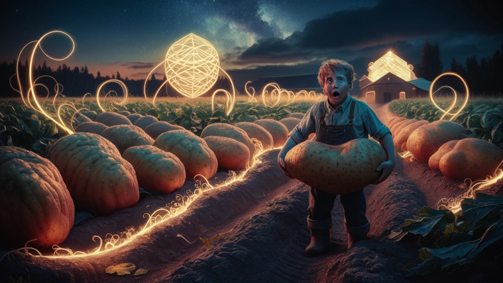 Thomas Hurley’s farm, long known for its fertile soil, has produced a harvest of truly biblical proportions. Crops grow at an unprecedented rate, with potato tubers of unusual size and vibrancy. Some claim to have seen strange glowing patterns in the fields at night, reminiscent of the intricate designs Madame Blavatsky describes in her ethereal lectures on cosmic geometry.