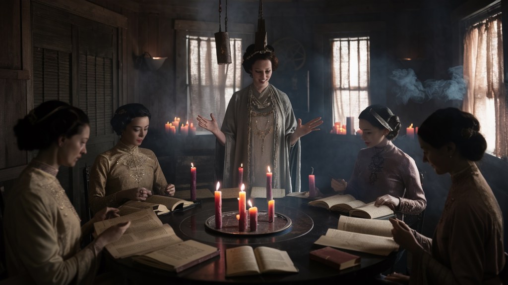 Mrs. Kirby’s temperance meetings have transformed into gatherings of a more esoteric nature. Women who once discussed the evils of drink now pore over ancient texts and debate the nature of consciousness. Mrs. Kirby herself has taken to wearing elaborate Eastern-inspired garments and speaks in riddles that leave her listeners both perplexed and strangely enlightened.