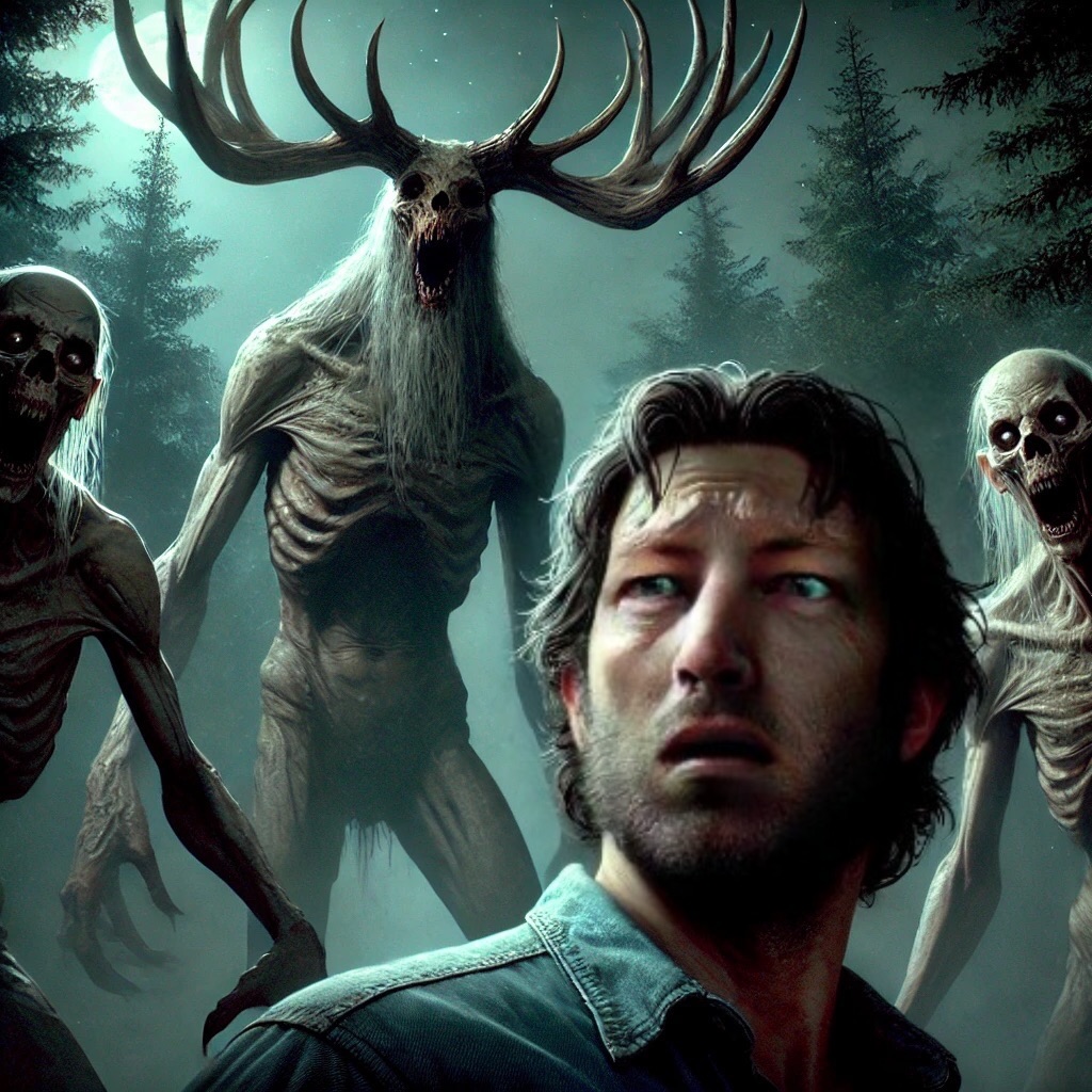 And then, like a fever dream come to life, five hulking figures lumbered out of the underbrush. Their forms twisted and grotesque, they moved with the drunken sway of men too deep in their cups—but these were no men. These were Wendigos, and not the kind that filled the cautionary tales of the old folks. No, these beasts were something altogether worse. They reeked of decay, their breath a sickly sweet stench that clung to the air like a curse.