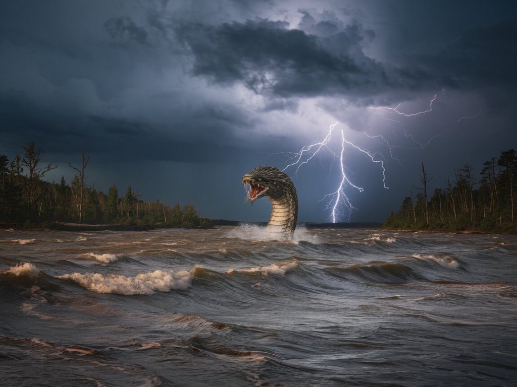 Suddenly, the earth trembled with a violence that rattled his bones. A guttural roar, primal and earthshaking, echoed across the lake, shattering the fragile peace. Johqu whipped around, fear crawling up his spine. From the depths of Chateaugay Lake, a monstrous form erupted – Berenice, the legendary Chateaugay Lake Sea Serpent, awakened from her slumber by the cosmic symphony that had shaken the very fabric of reality.