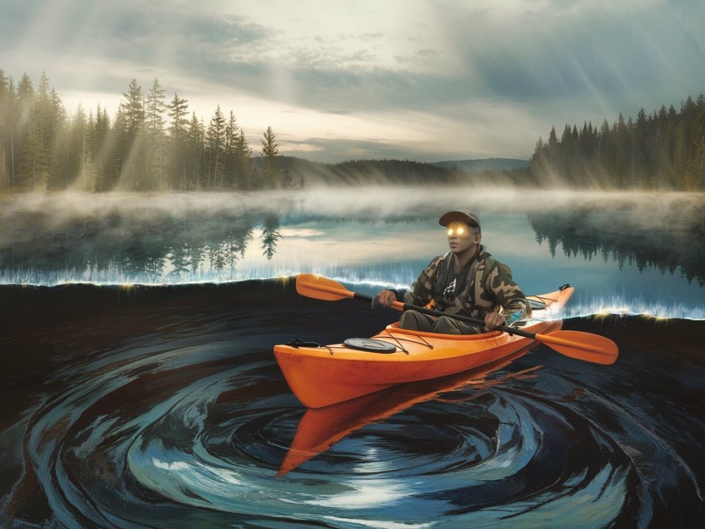 The water around the kayak began to ripple, not from any breeze, but as if something beneath the surface was awakening. The reflection of the trees wavered and then vanished altogether, replaced by a swirling darkness that seemed to stretch infinitely downwards, a vortex of shadow and light. M’zouqué opened his eyes, and they were not the eyes of a man but of something ancient, something that had seen the birth and death of countless worlds.