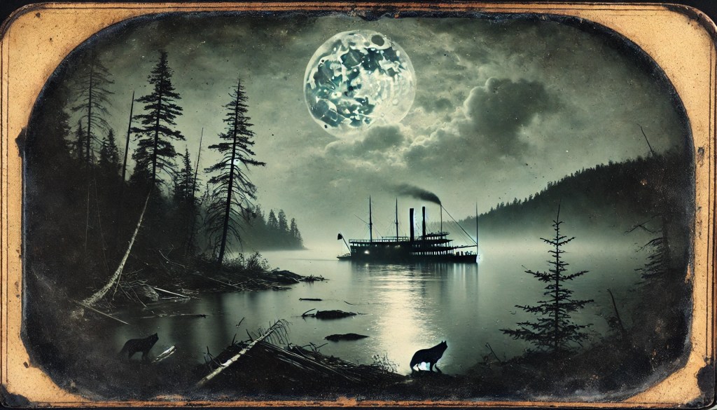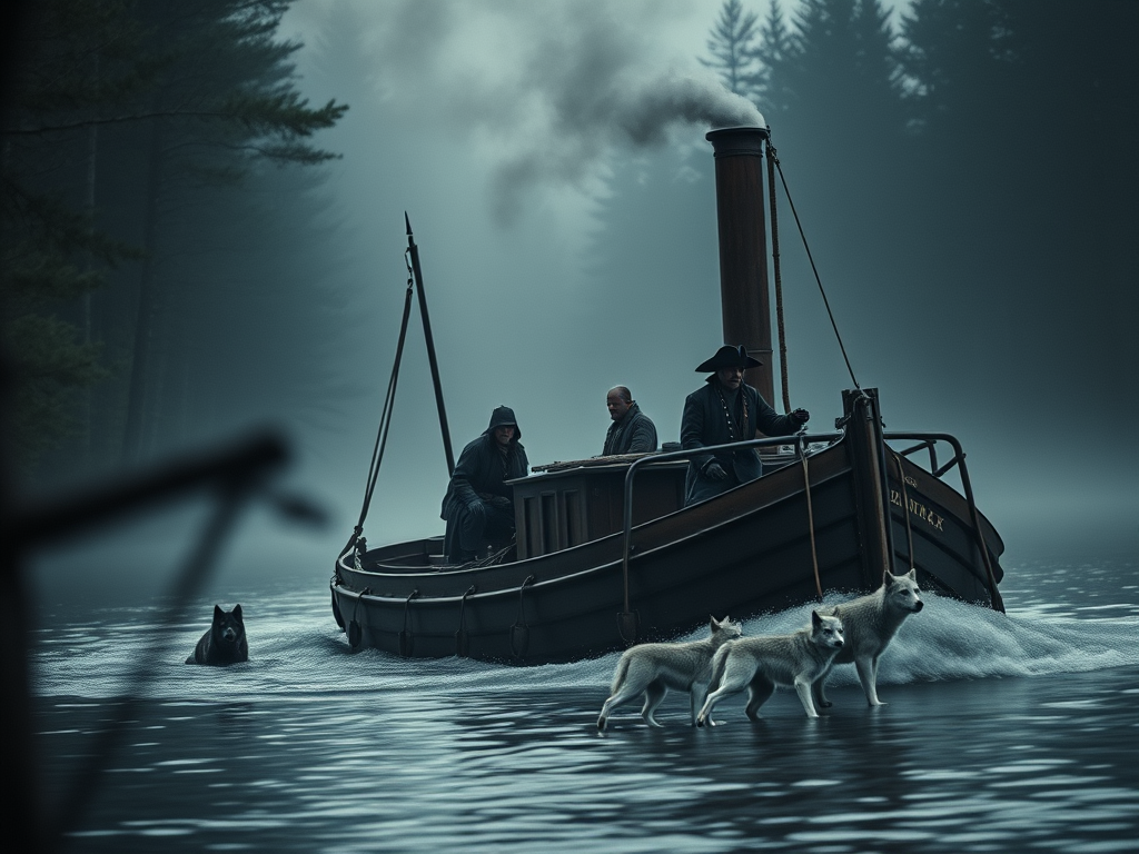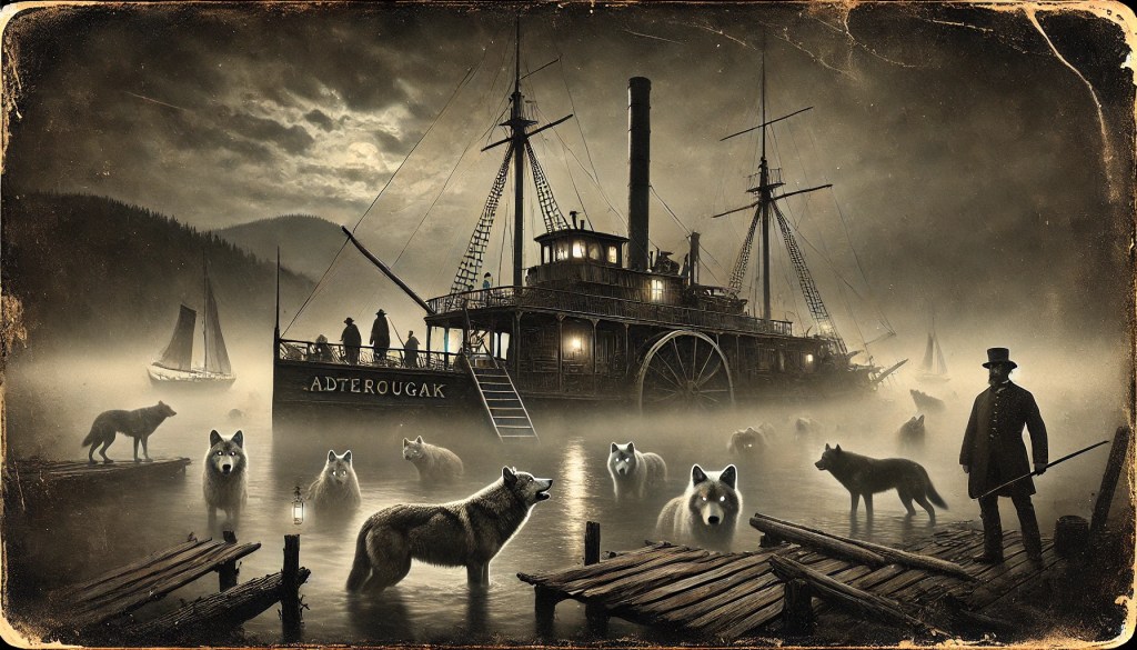 Now, you might wonder, “What’s a wolf doin’ on a steamboat?” Well, let me tell you, that’s where it gets real weird. You see, Red had himself a deal with traders up north, where the wolves still roamed the high hills of the Adirondacks. Timber wolves, mighty beasts, wild and free—what some folks hereabouts might call amitsuskwa, the spirit guardians of the deep woods. I reckon they were a lot like Red and his men—outlaws to the world, but somethin’ to be feared and revered all the same.