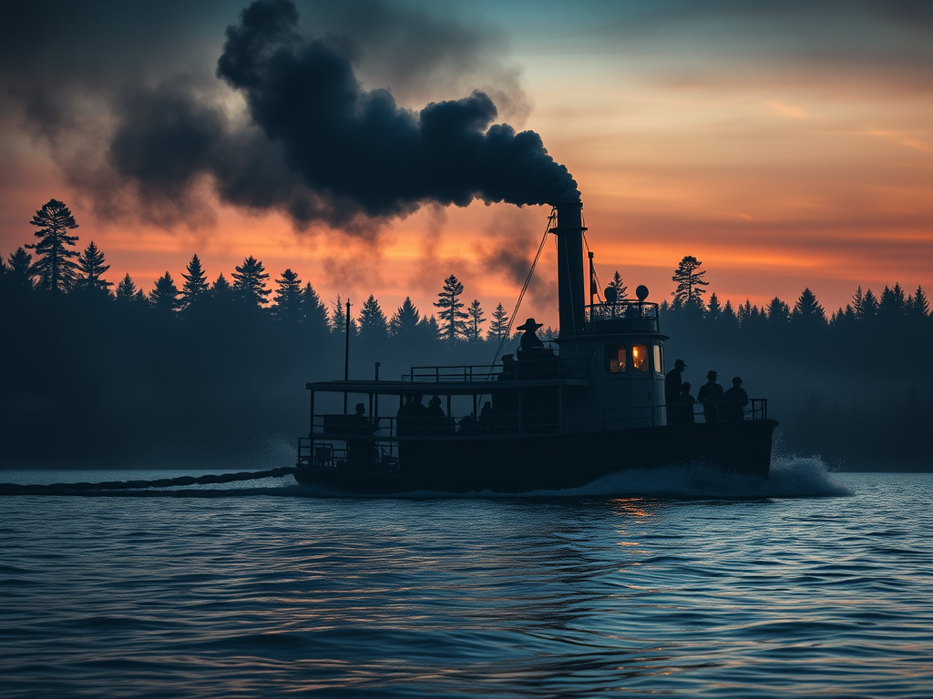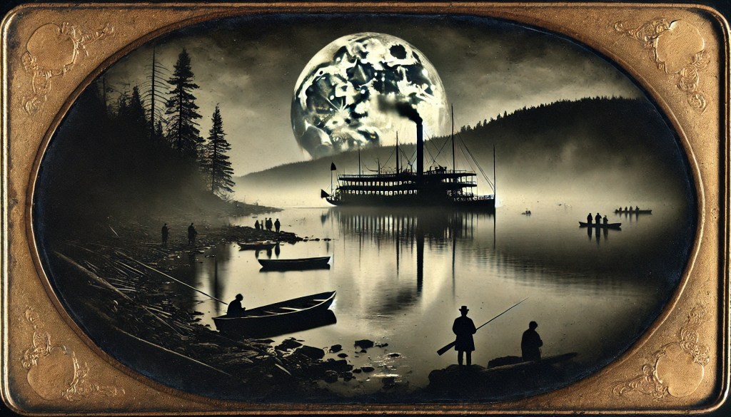 One moonless night, the Adirondack set off from Indian Point. Now, my grandfather swore he was fishing from the shore, just sittin’ there with his lantern, when that old boat passed by—quiet as death itself. He said he heard the howls from below deck, wild and desperate, mixed with the eerie cry of a loon. He swore the whole night felt wrong, like the lake itself was howling back at the wolves.
