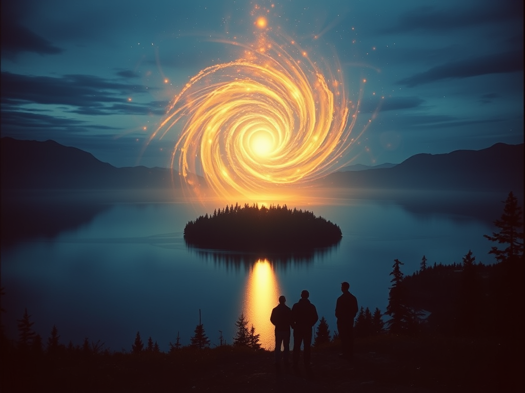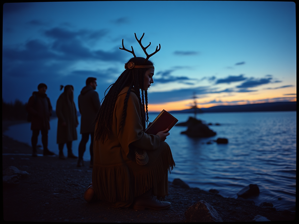 The lake shimmered under a sky that seemed stitched together, patches of deep indigo and faint gold weaving an eternal twilight. Seven travelers stood at the edge, weary from their week-long journey but awed by what lay before them. The leader, a woman named Tensha, with hair braided in patterns that told the story of her clan’s resilience, knelt to touch the water. Her fingers felt warmth and cold at once, as if the lake itself embodied the Kahnikwehsan’s philosophy of balance.