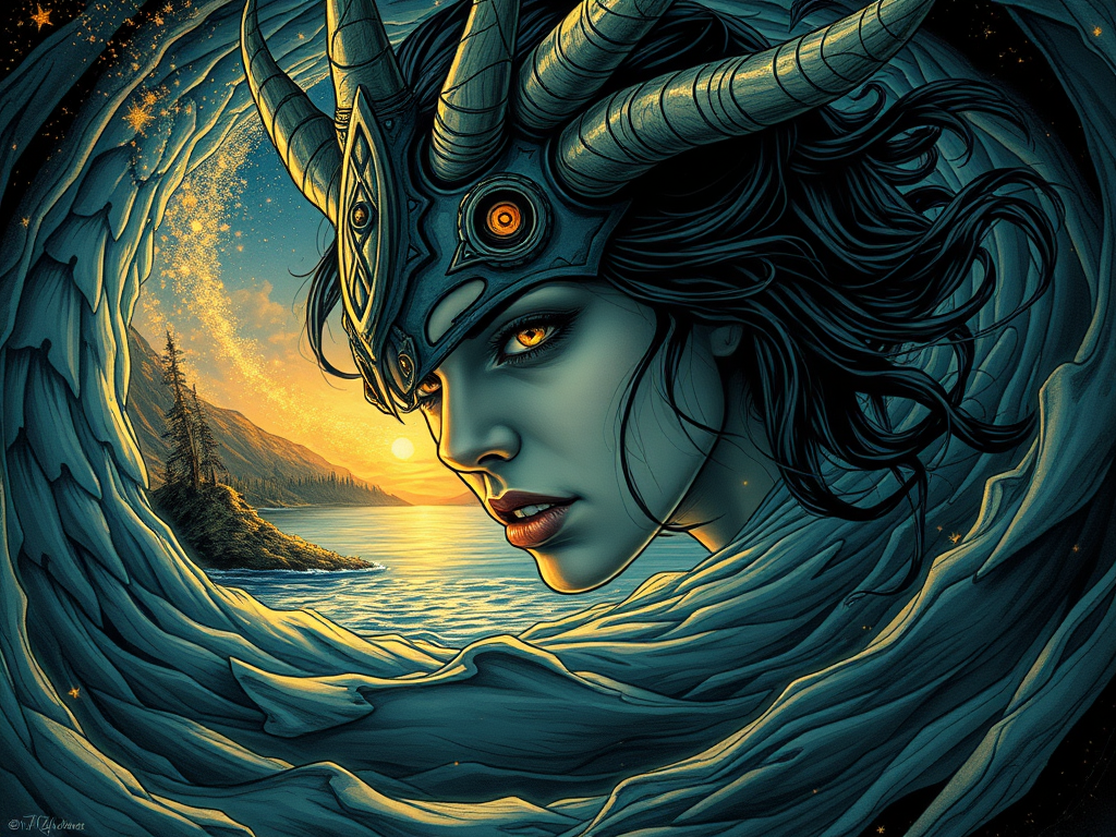 Vekri, restless and emboldened by her dreams, ventured to Ahsionohka Lake’s edge one night. There, she saw it: a vortex swirling above Nokathen Isle, its colors like spilled oil—impossible hues that writhed and folded into each other. A figure emerged, neither beast nor human, but something wholly other. It moved with a grace that defied physics, its limbs jointed in places that didn’t exist, and its gaze was not a gaze at all but an absence—a void that consumed light and left only questions.