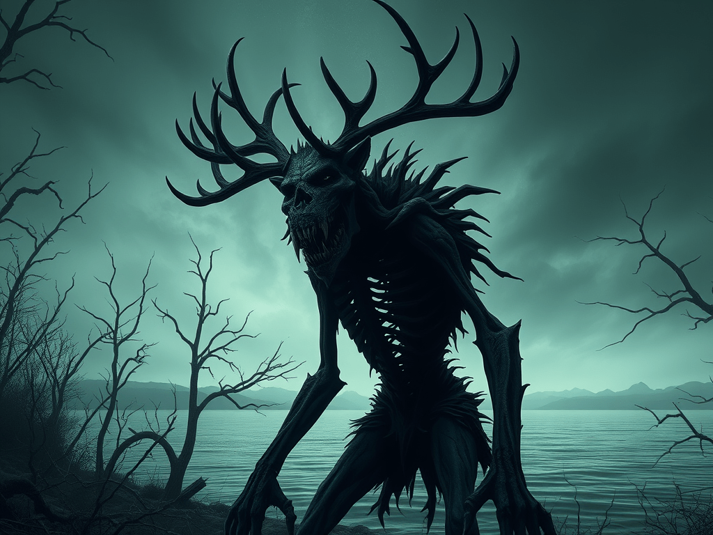 The shores of Iterative-14’s Chateaugay Lac were a haunted mirror of the prime timeline—a twisted reflection where the skeletal trees leaned inward, their blackened branches clawing at the fractured sky. The lake itself was still, a void of liquid night where time neither flowed nor stood still but wavered in a nauseating stutter. Here ruled Vartholox, the Wendigo incarnate, his gaunt frame towering, crowned with antlers that pierced the sky’s cracks. His maw, rimmed with jagged teeth, dripped with the essence of eternity: greed, gluttony, and unbound hunger.