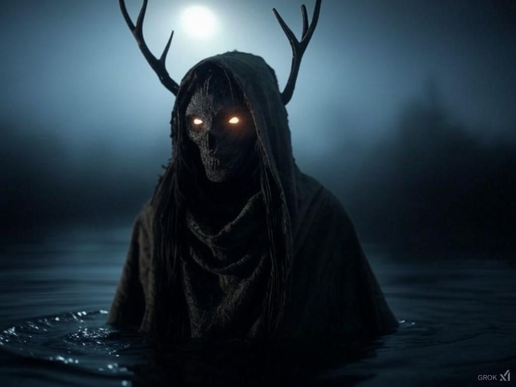 Awakened by a rhythmic, hollow drumbeat echoing across the lake, Collins ventured outside his tent to investigate. Thatās when he saw it: a figure, knee-deep in the water, wearing a tattered, shimmering cloak and crowned with iron antlers. Its fiery, coal-like eyes burned into his soul as it uttered a messageānot in words, but in thoughts: