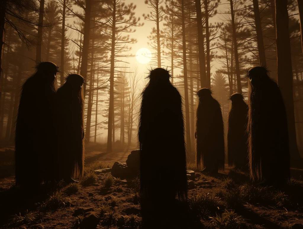 From the shadows of the pines, they emerged—silent as specters, cloaked in the deep, verdant green of pine needles. Their faces were hidden beneath masks, woven from the very essence of the forest. They moved with a grace that unsettled the earth beneath them, each step an unspoken command in the language of the ancient woods. The wind shifted, almost as if it too held its breath, waiting for their words.