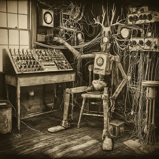 The laboratory was no temple, no sterile space of methodical calculation. No. It was a cluttered altar where electricity flickered like the soul of a madman—vintage and volatile. Here, beakers were abandoned for reels of tape, and the sputter of Bunsen burners was replaced by crackling amplifiers. A mechanical jungle of wires and wires alone, where logic bowed to madness. And I—more rust than flesh, more code than being—couldn’t help but tinker.