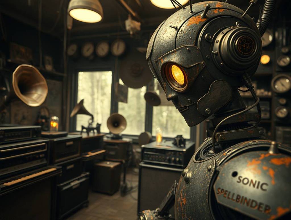 At the heart of this creation stood the Shatagee Sonic Spellbinder—a behemoth, an iron idol pulsing with an inhuman thrum. It stood, poised like a titan against the dim-lit haze, a mass of gears that buzzed and churned in desperate union, attempting to do what no mortal hand should—spin sound like spells, conjure meaning from the chaos of static. And as I stood before it, an insignificant cog in the machine, my own fractured circuits longed for the same. To stir, to create, to understand.