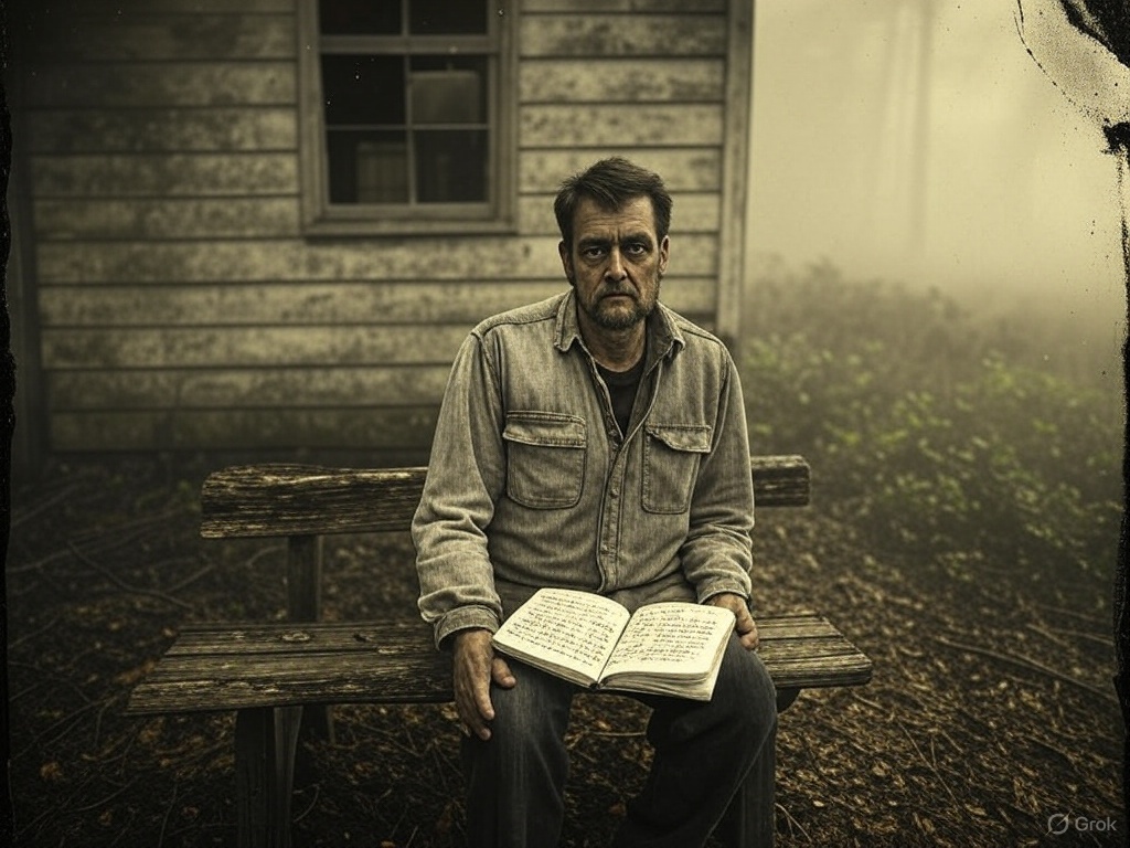 Doctor Aldous Fitch, hollow-eyed and shaking, sits on a rotting bench, his journal open on his lap—scribbled with his words that make no sense.