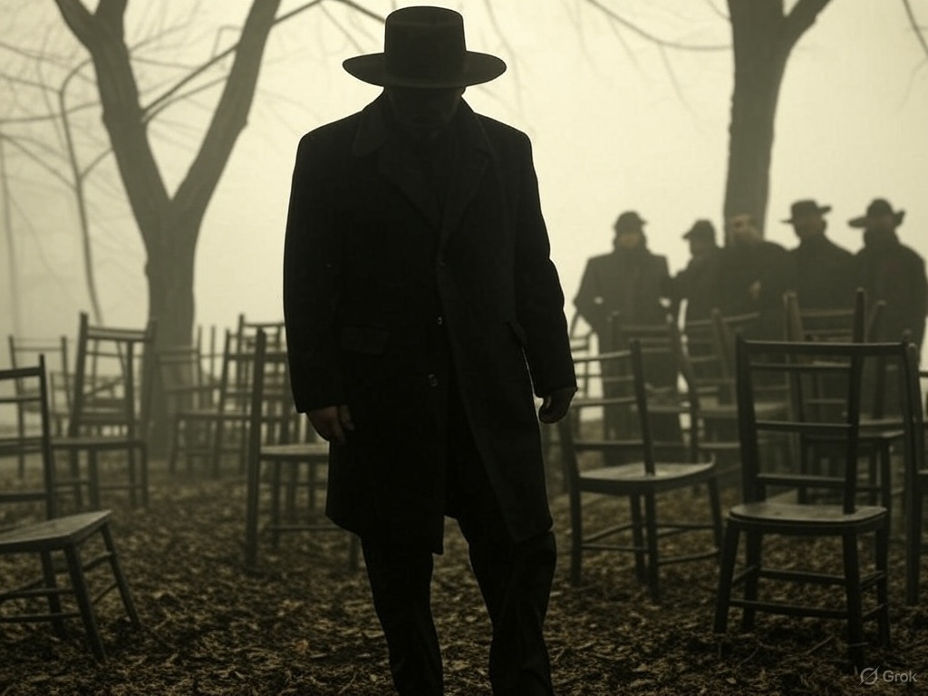 De spies circled, eyes dartin’ ’round, starin’ at de useless chairs like dey were clues to some grand conspiracy. One spy, with a monocle slid down his nose, leaned in close to another and whispered, “I reckon there’s more to dis ritual than meets de eye.” And just then, de wind picked up, rustlin’ de leaves, as if nature herself were laughin’ at de absurdity of it all.