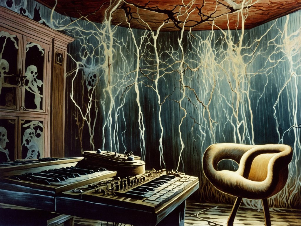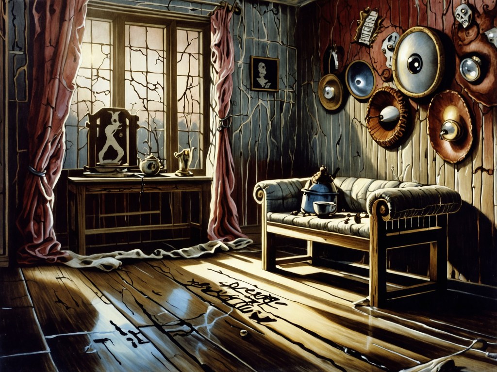 But not a room room. This one’s made o’ long-forgotten chords, and the walls are held up by guilt and ashwood. There’s a table with a teacup what whispers your own name in a voice two octaves below thunder, and a metronome made of squirrel bones tickin’ out the last seconds of somebody else’s childhood.