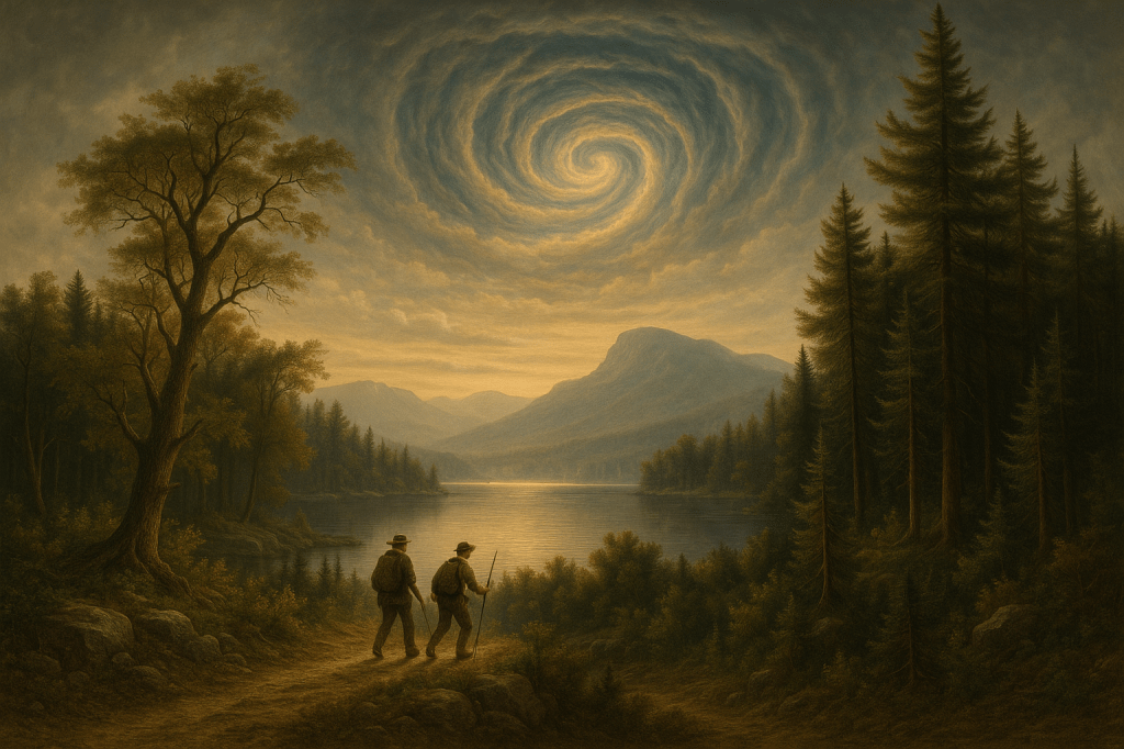 It often starts with a lone trapper or hunter spendin’ too many nights in the deep woods around the South Inlet, maybe near old Nat Collins’ cabin site on Baker Point. The forest there goes quiet as a grave. Then the poor soul notices things ain’t right. Trees seem to shift at the corner of his vision. Strange shapes peer from behind trunks, then vanish when looked at straight. He might hear his own name in the pine needles—only there’s no wind to carry any voice. That ancient name Chetegewet, Place Where the Sky Hums, starts to make an eerie kind of sense as a faint vibration fills the air.
