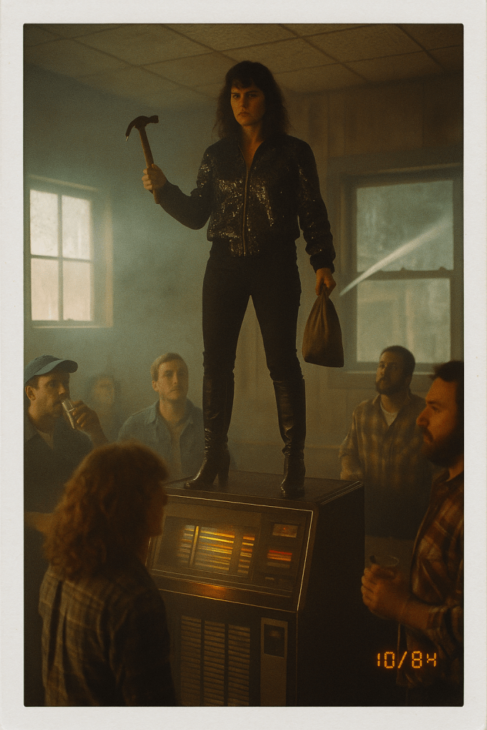 She stormed in — boots like black knives, jacket sequined with a dozen sins, hammer in one hand, sack of nails in the other. Stompin’ across the sticky floor like she owned it, like it owed her. Nailed the front door shut. Then the back. We all watched, dumbfounded, sippin’ flat beer. Ain’t nobody leavin’ ’til the truth gets told, she said, and by God the silence was biblical.