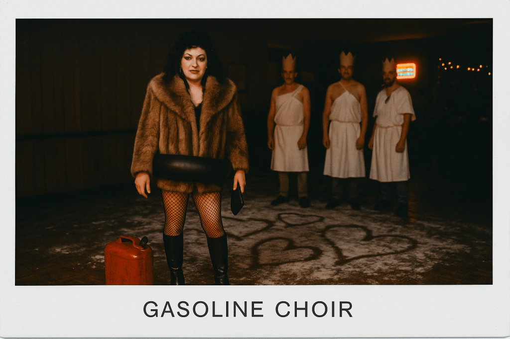 Three men she picked — Big Timmy with the lazy eye, Doug from AutoZone who never blinked, and Dwayne, who may not’ve been real. She wrapped ‘em in bedsheets and smeared lipstick across their cheeks like war paint. Duct-taped beer boxes to their chests, told ‘em to strut. Told ‘em to lip-sync to Tainted Love while she sprayed gasoline hearts on the floor.