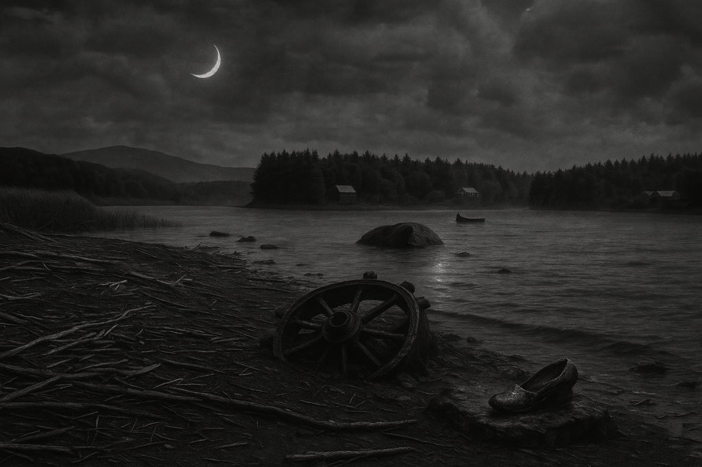 Inside it: bones. Not human. But shaped like the fused ribcage of something humanoid that had never walked upright. Black and glossy. As though coated in… lake mud and charcoal soot.