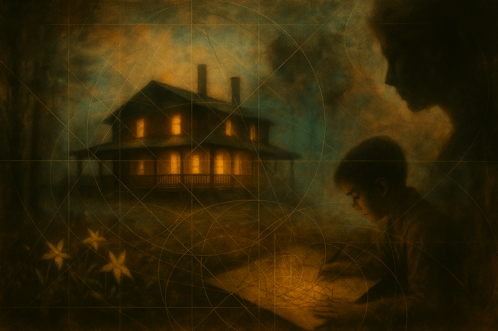 At dusk, the lodge’s windows glowed with lantern light that sliced through the gathering mist. I returned to my drawing on the lawn, laid my page flat, and traced new spirals—overlapping, interlocking—until the entire scene sat within a lattice of sacred geometry. Mother peered over my shoulder. Her breath came in quick, shallow gasps. “What are you drawing, Russell?” she asked, voice brittle as dried reeds.