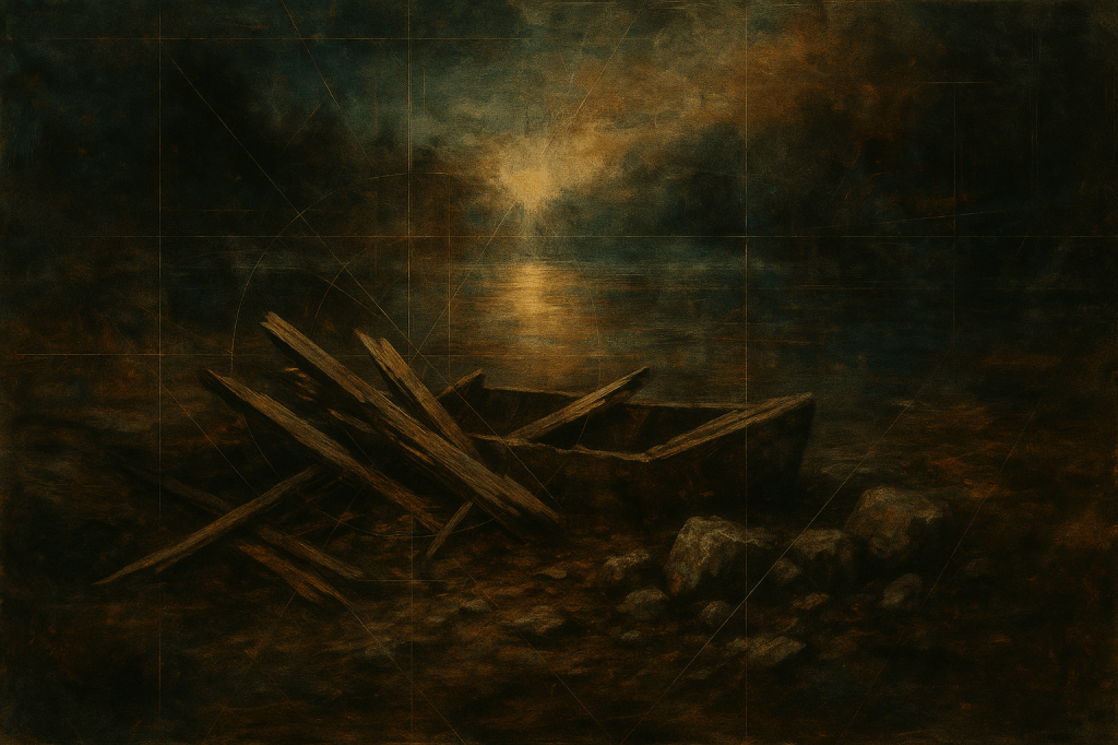 Left alone on the shore, I sank to my knees and opened my sketchbook. The golden‐ratio spirals now twirled inward until the lilies formed a ring around the lodge, and the broken planks lay like ribs beneath the water’s skin. I drew a final spiral at the page’s center, sealing the scene with graphite’s promise of truth.