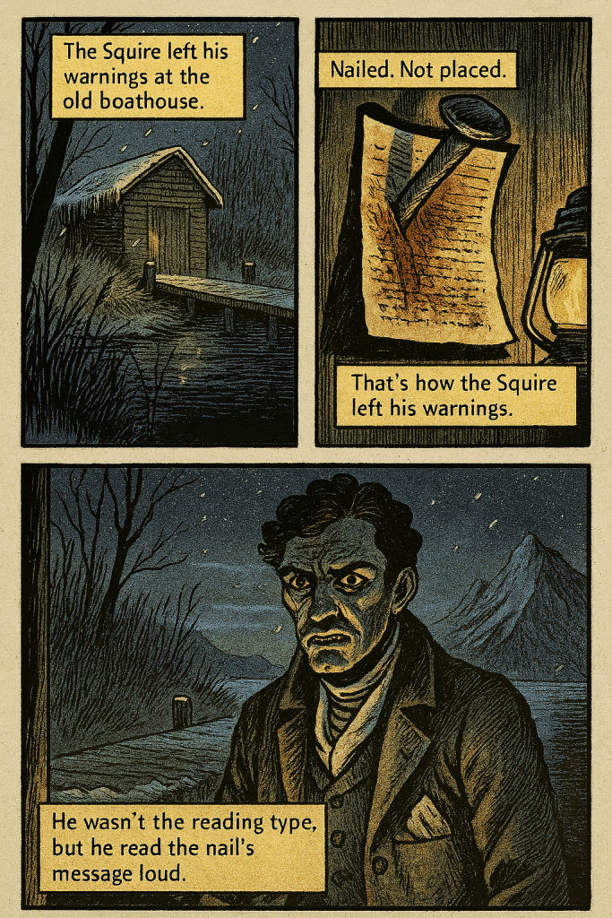ADVISORY: Features intense visual depictions of spectral vanishings, unnatural weather, eerie symbols, lake anomalies, and a climactic emergence of a mysterious antlered entity. May unsettle readers sensitive to backwoods lore or cosmic dread.