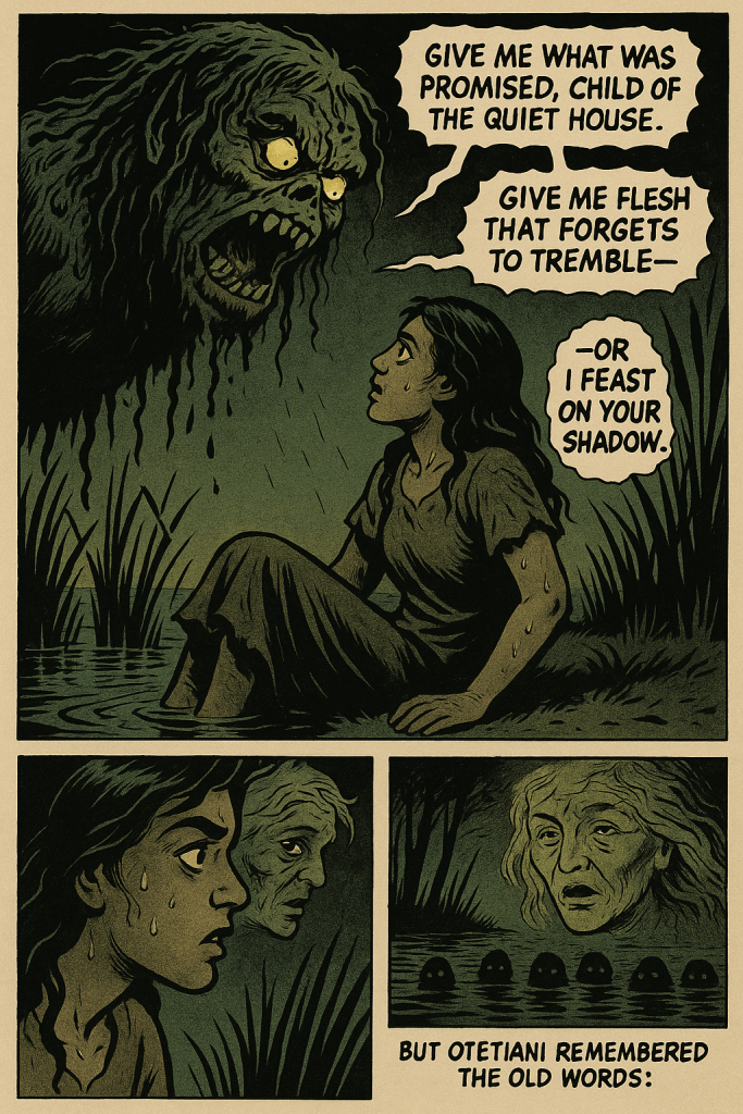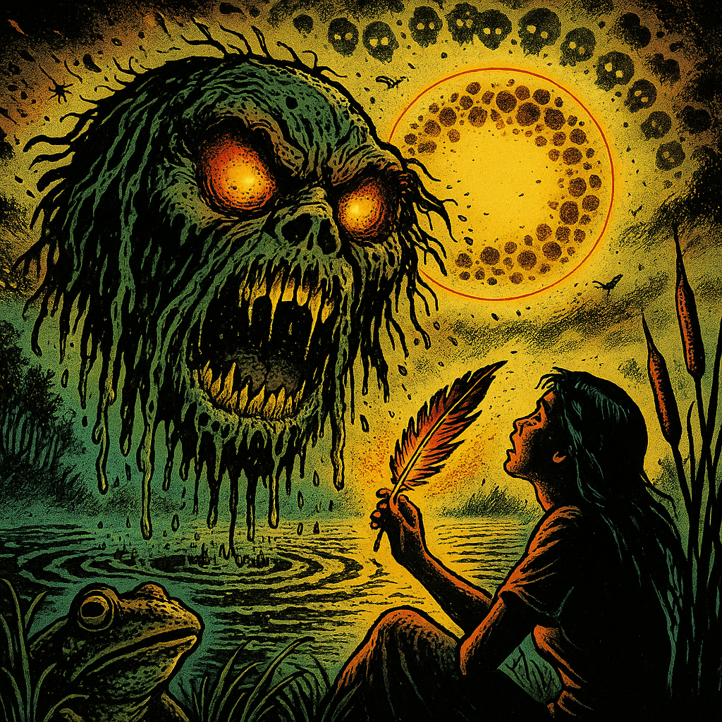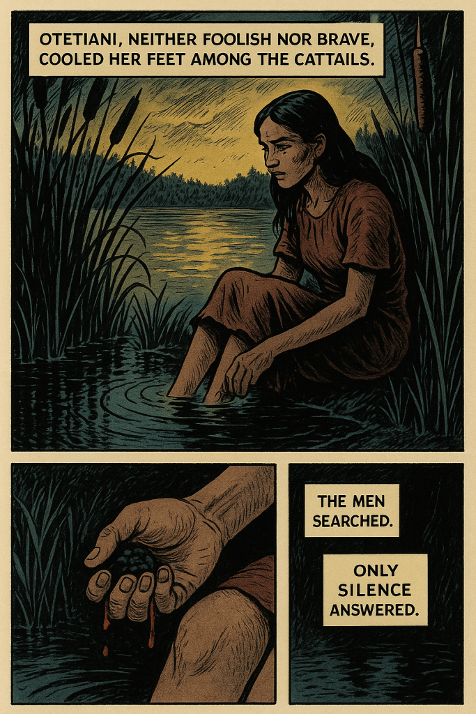 One night, when the moss still sweated from the day’s heat, a young woman called Otetiani—she who is prepared—sat alone beside the water, cooling her feet among the cattails. She was neither foolish nor brave, but something gnawed at her heart: her little brother had vanished that morning, his basket of berries spilled in a silent trail up the slope. The men had searched; only the frogs replied.