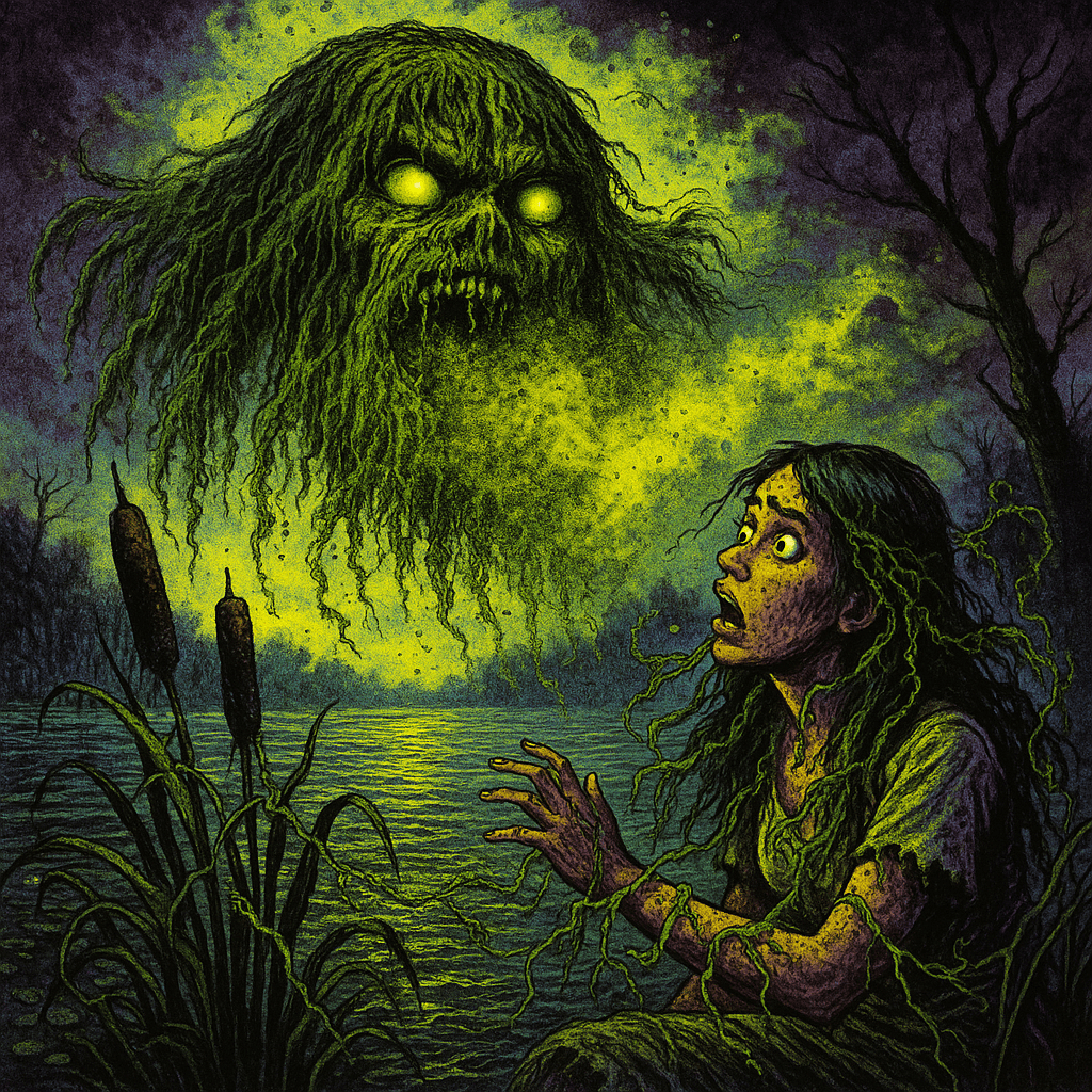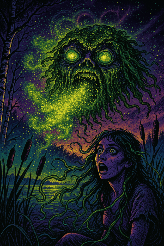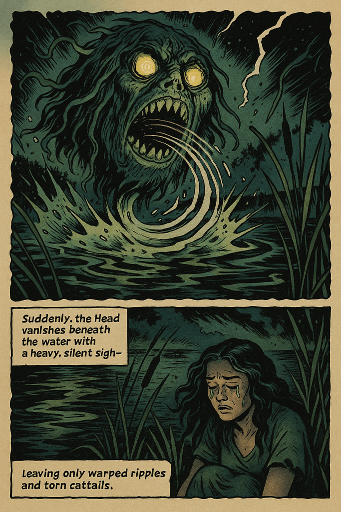 It was the Head: no body, only a face vast and wet with lake-scum, hair like water weeds trailing behind, and teeth glinting as if carved from fishbone. Its eyes burned with summer lightning. Where it passed, the air curdled, and the wild celery drooped.