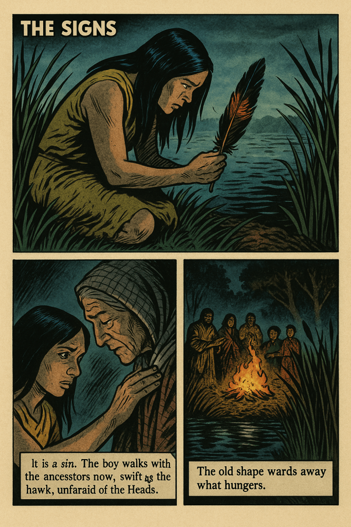 “It is a sign. The boy walks with the ancestors now, swift as the hawk and unafraid of the Heads.”